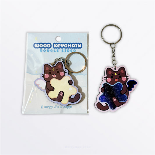 Star Angel + Devil Cat Double-sided Wood Keychain