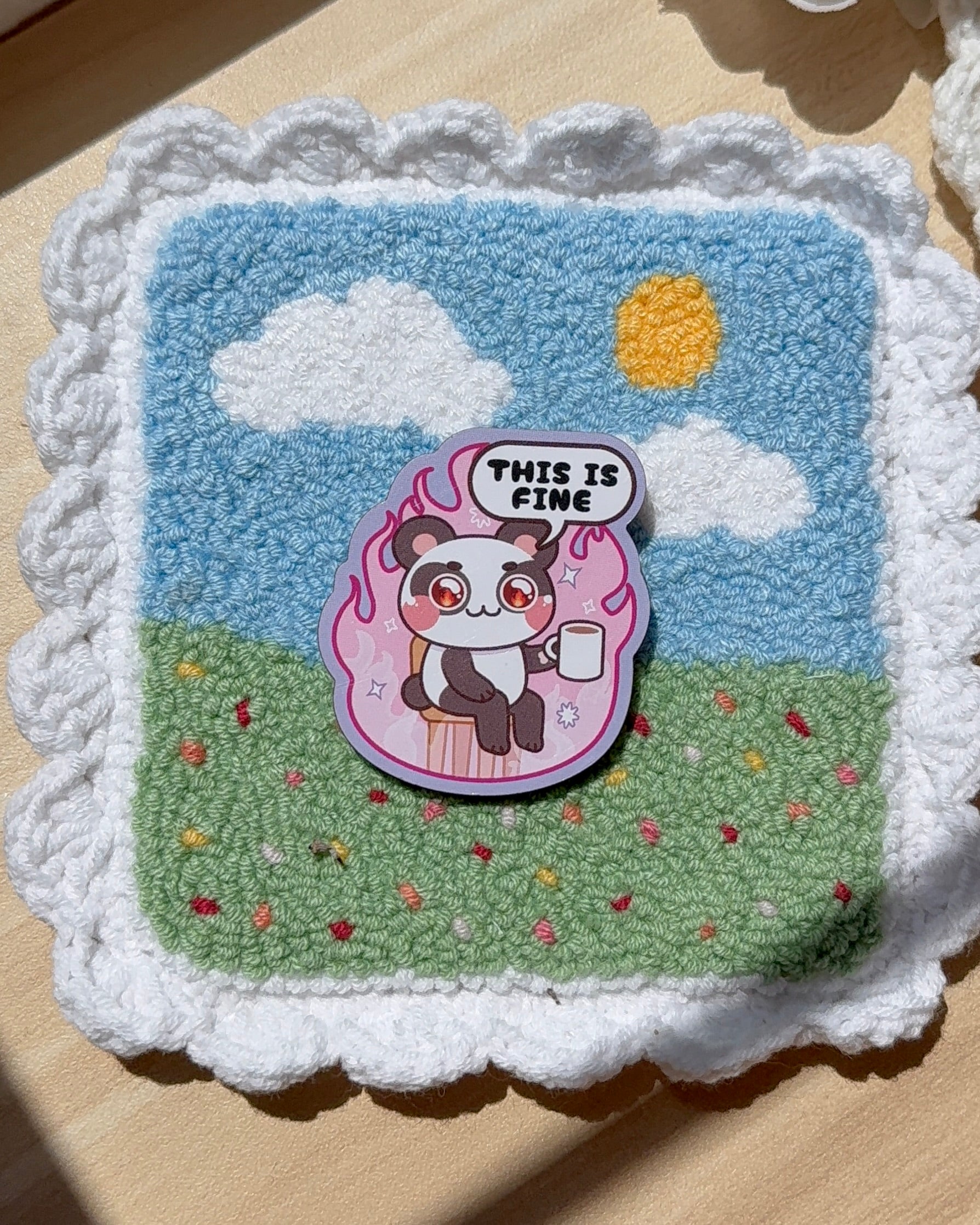 Survive another day in the fire with a Panda This is Fine wood pin. Made from sustainable wood with a gold locking pin on the back. Choose from our cute cast of critters: green frog, pink frog, capybara, white bunny, panda, black cat, white cat, calico cat, or rainbow cat!