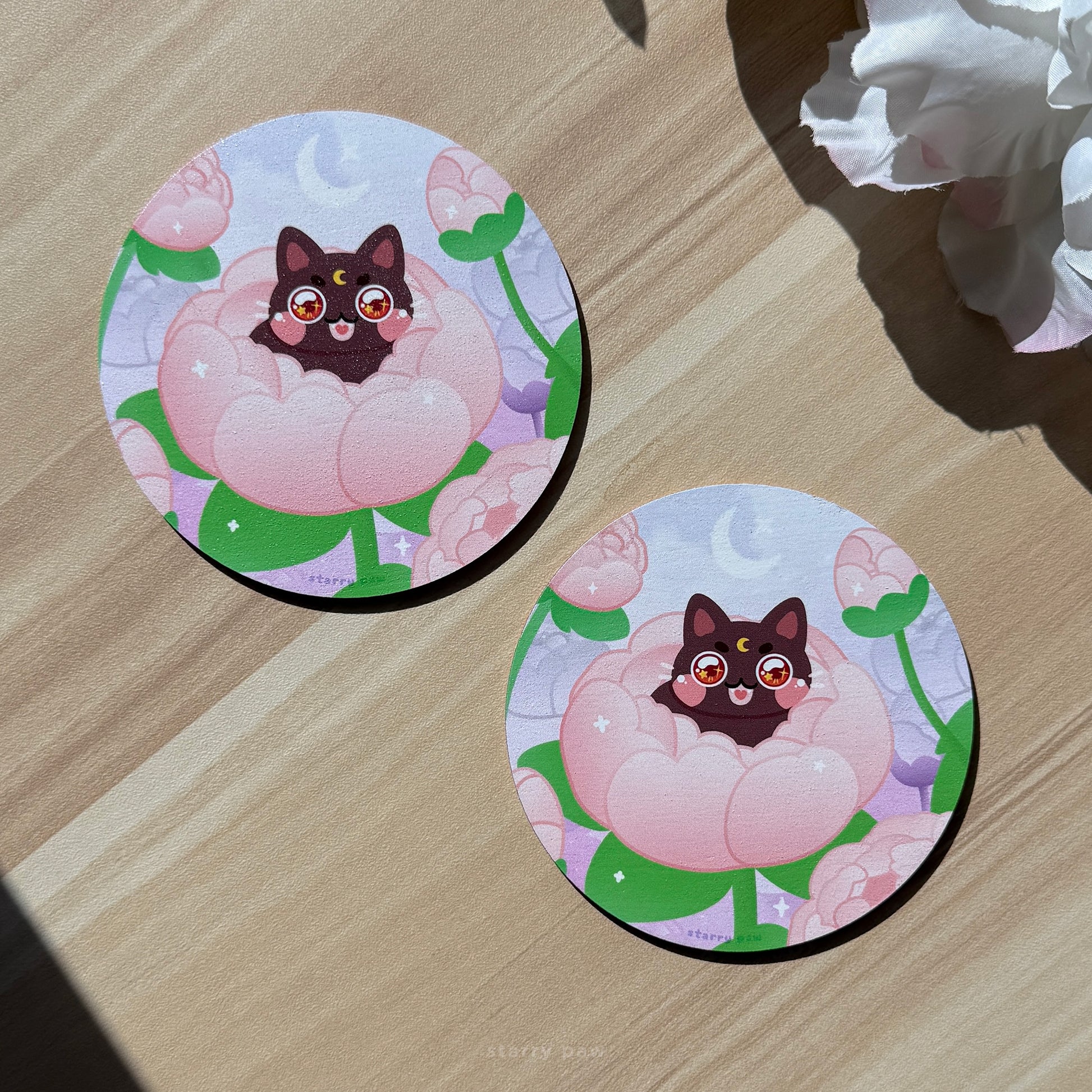 Protect your tables with our Peony Flower Black Cat Wood Coaster, featuring a cute kitty sitting inside a pink peony flower.